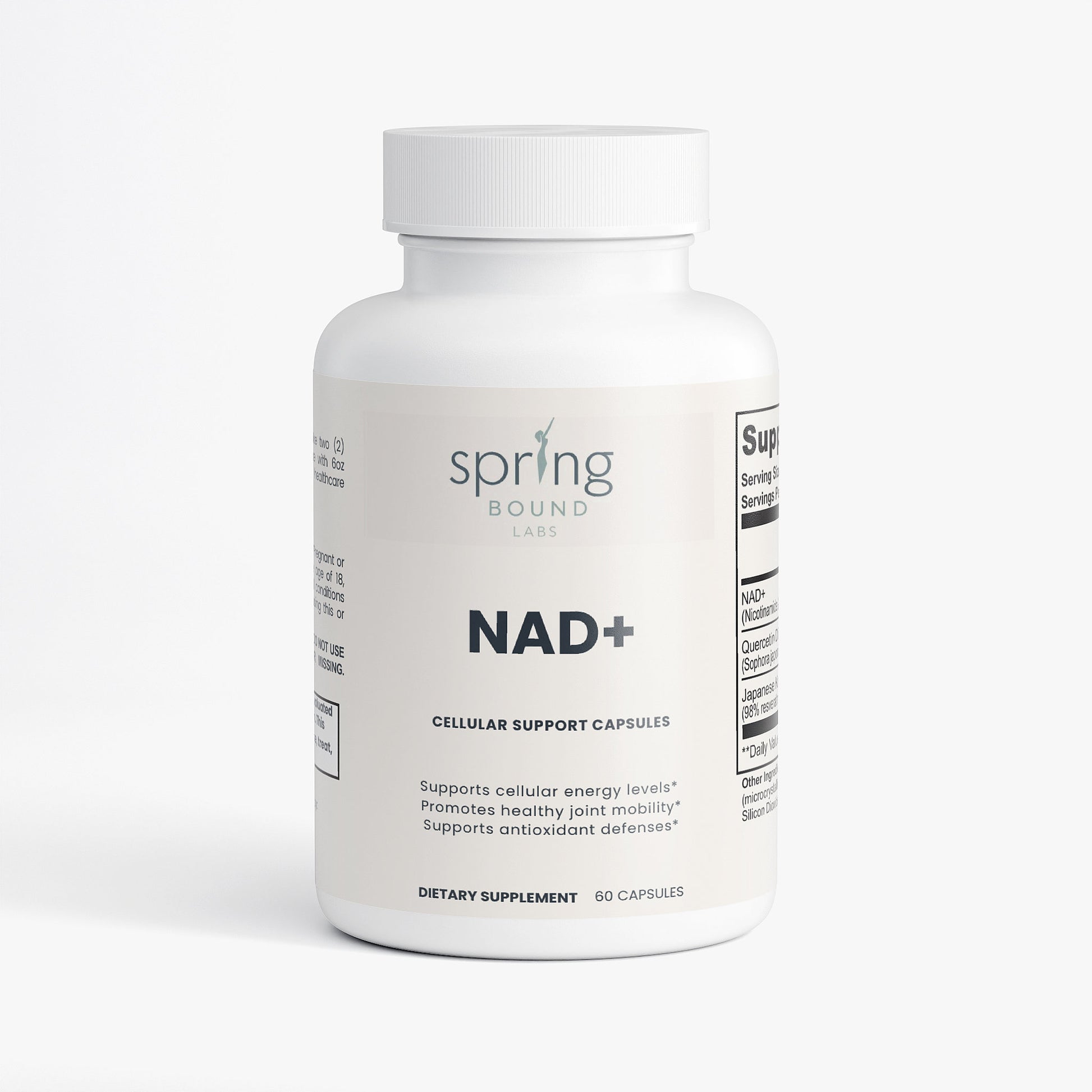 Ingredients: NAD+ (Nicotinamide Adenine Dinucleotide) (500 mg), Quercetin Dihydrate Extract (Sophora japonica) (whole flower bud) (250 mg), Japanese Knotweed Extract (98% Resveratrol) (Polygonum cuspidatum) (root) (150 mg), HPMC (vegetable capsule), Microcrystalline Cellulose (MCC), Brown Rice Flour, Olive Oil, Silicon Dioxide, Magnesium Stearate.